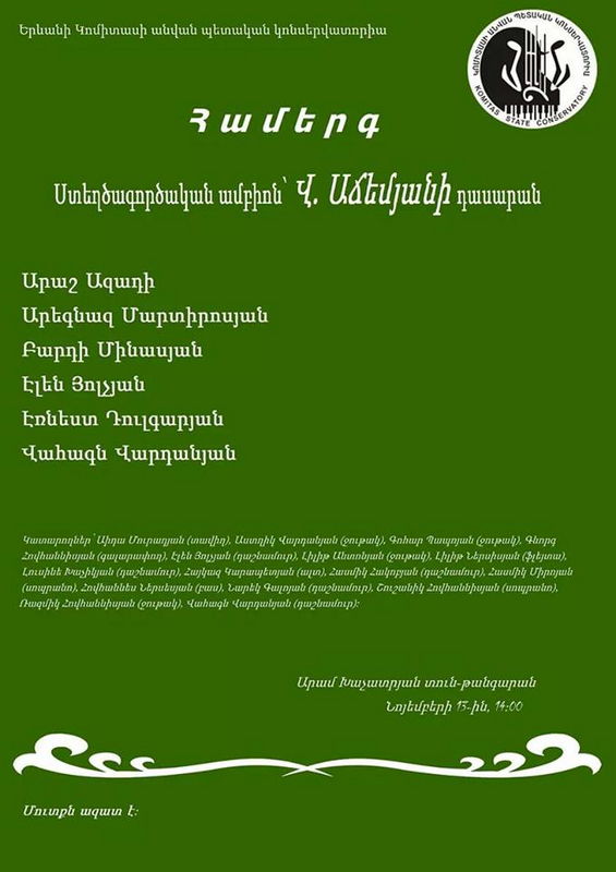 Նոյեմբերի 13-ին Արամ Խաչատրյանի տուն-թանգարանում կկայանա ՀՀ Արվեստի Վաստակավոր գործիչ, կոմպոզիտոր Վարդան Աճեմյանի ստեղծագործական դասարանի ուսանողների համերգը: Համերգին կհնչեն Արաշ Ազադիի, Արեգնազ Մարտիրոսյանի, Բարդի Մինասյանի, Էռնեստ Դուլգարյանի և Վահագն Վարդանյանի ստեղծագործություններից: Համերգի սկիզբը՝ 14:00: Մուտքն ազատ է: