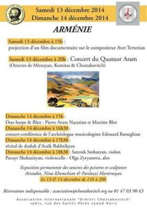 Հայաստանի Կոմպոզիտորների Միությունը, Դմիտրի Շոստակովիչ միջազգային ասոցիացիայի հետ համատեղ ներկայացնում է Հայ երաժշտության օրերը Փարիզում: Այս նախագծի ընթացքում տեղի կունենա ինչպես համերգաշար, այնպես էլ կոնֆերանսներ՝ նվիրված հայկական մշակույթին՝ մասնավորապես հայ երաժշտությանը: Փարիզի Դմիտրի Շոստակովիչի անվան կենտրոնում դեկտեմբերի 13-ին նախ տեղի կունենա Ավետ Տերտերյանին նվիրված վավերագրական ֆիլմի ցուցադրությունը, ապա “Արամ” լարային քառյակը կհնչեցնի Կոմիտասի, Միրզոյանի, ինչպես նաև Շոստակովիչի ստեղծագործություններից: Դեկտեմբերի 14-ն ավելի հագեցած է լինելու. նախ կհնչի երաժշտություն՝ ֆլեյտայի և տավիղի համար գրված դուետներ, հետո տեղի կունենա համերգ-կոնֆերանս Էդուարդ Բարսեղյանի մասնակցությամբ: Ժամը 17:30-ին կկայանա դուդուկահար Արայիկ Բախտիկյանի սոլո համերգը, իսկ երեկոն կավարտվի ջութակի, ալտի և թավջութակի հնչյունների ներքո.կհնչեն հայ կոմպոզիտորների ստեղծագործություններից:Այս նախագծի գեղարվեստական ղեկավարն է Սաթենիկ Սմբատյանը: